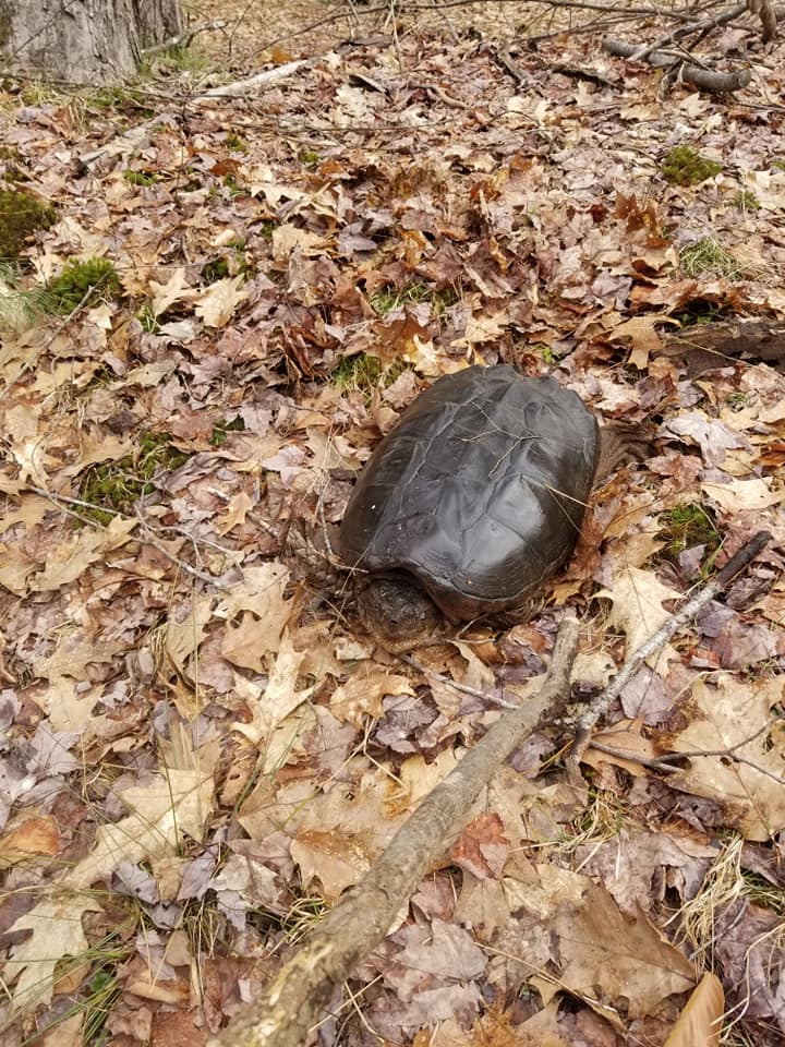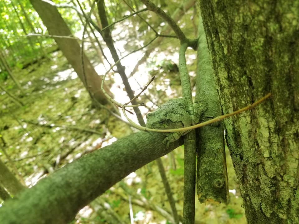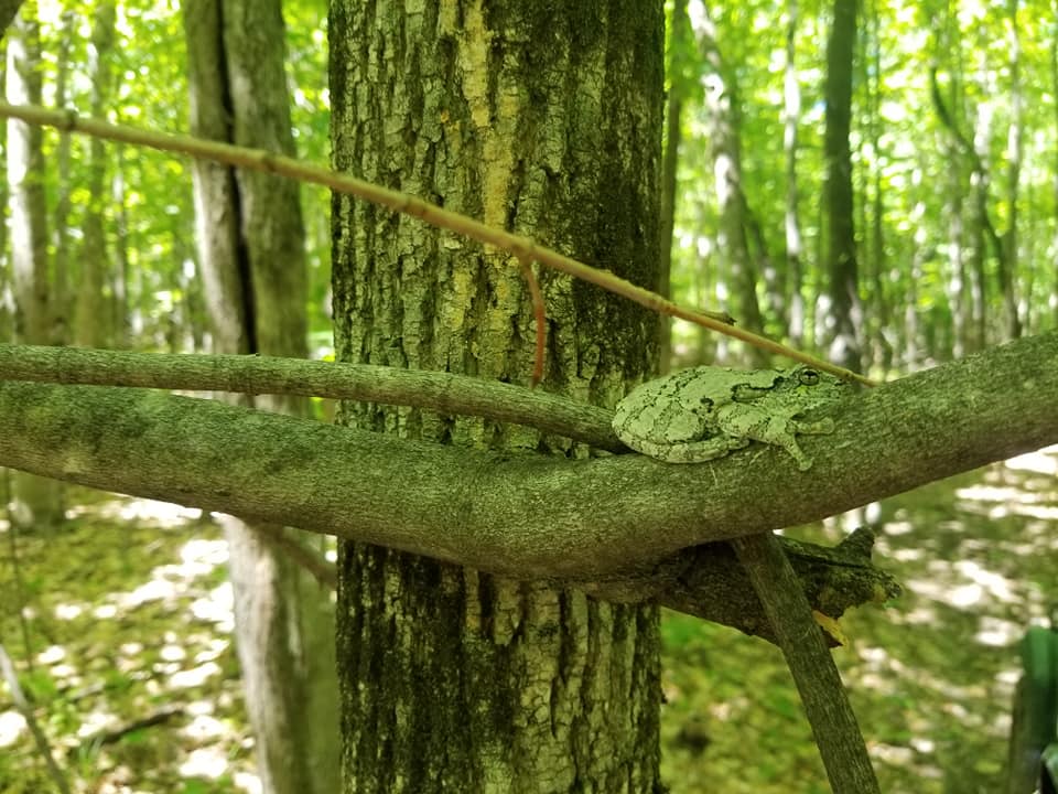 Hello friend! I found this little guy while maintaining our trails. He is a gray tree frog, the only tree frog native to NH.